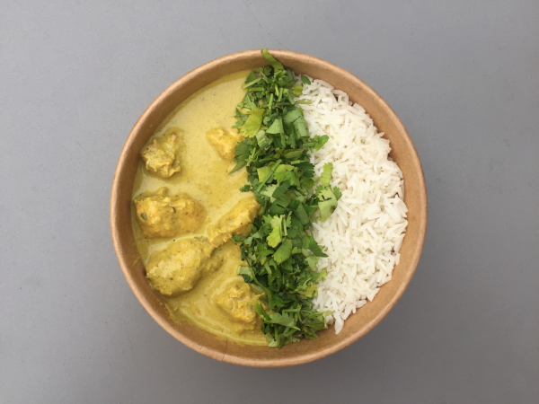 Kawałki piersi z kurczaka w maślano-pomidorowym sosie, podawany z ryżem Basmati